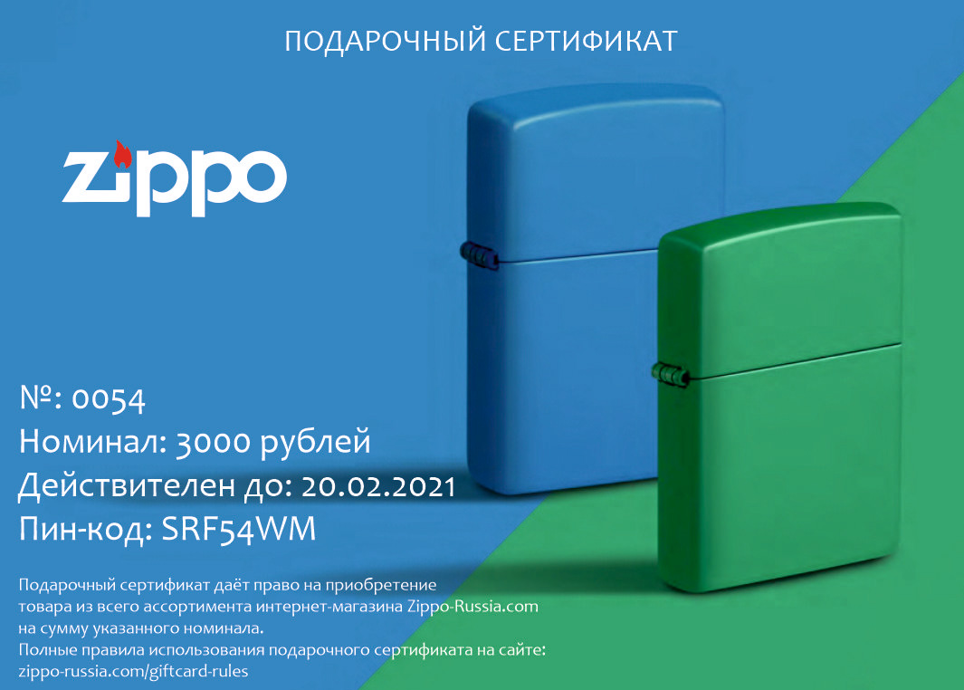 Подарочный сертификат Zippo 7000 от официального дилера Zippo в Набережных Челнах. Вы можете дополнительно заказать гравировку, которая подчеркнет Вашу оригинальность и придаст памятность статусному подарку.